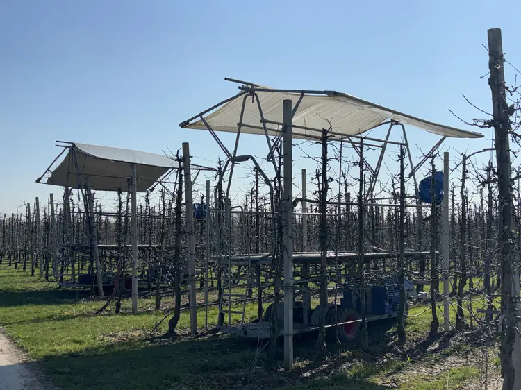 In deze periode zie je in veel boomgaarden een opvallende witte waas over de bloesem hangen. Dit komt doordat fruittelers kalk (calciumcarbonaat) op de bomen spuiten.