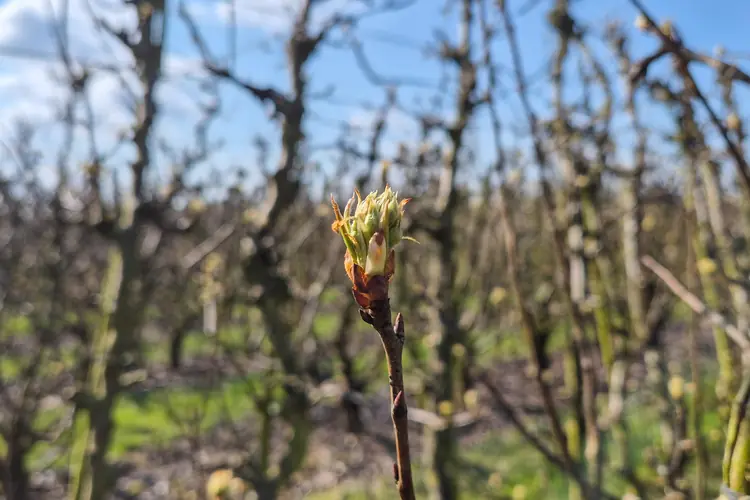 In verschillende boomgaarden beginnen de perenbomen hun bloemknoppen te laten zien. De bloesem zelf is nog niet open, maar je ziet duidelijk dat het seizoen eraan komt.