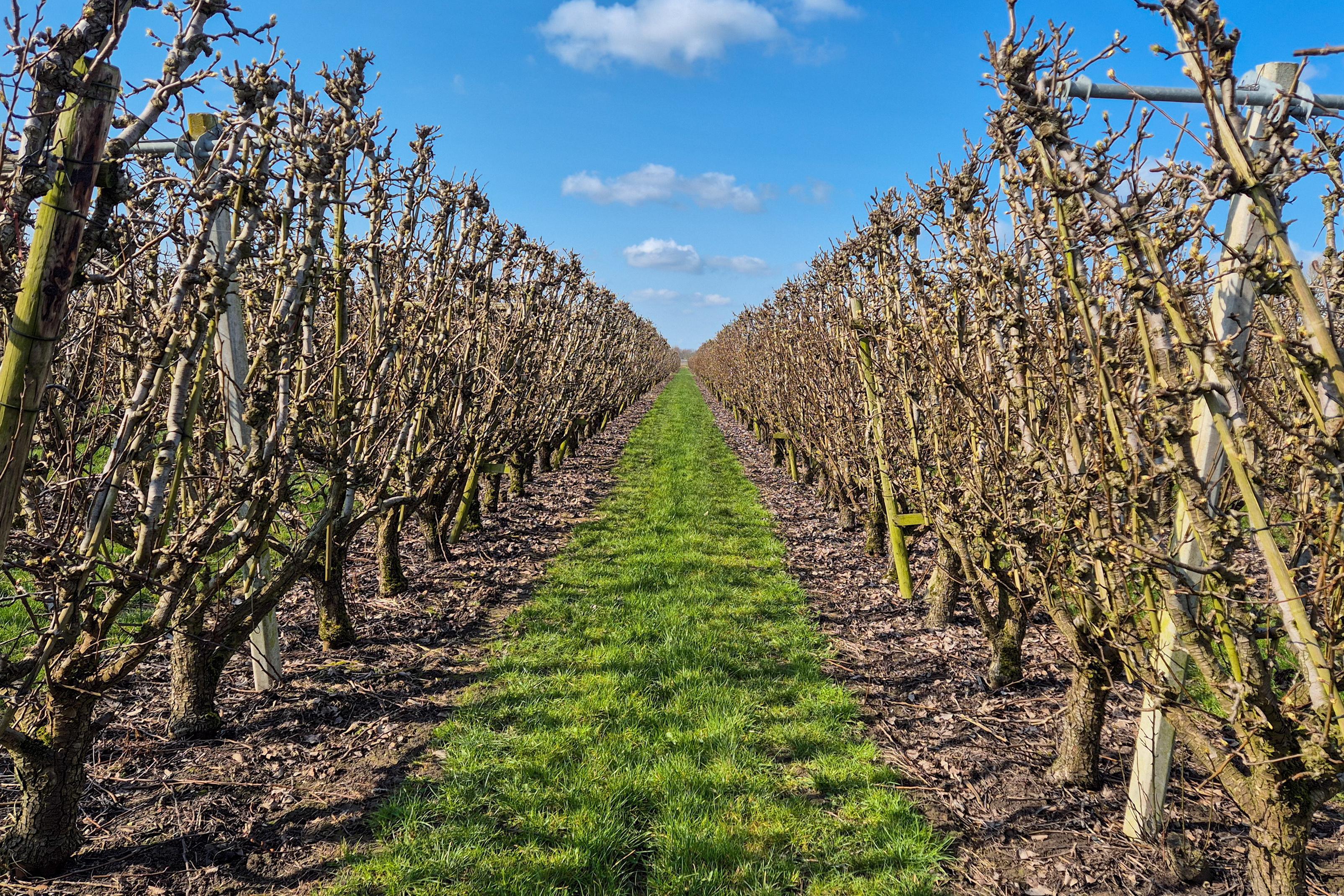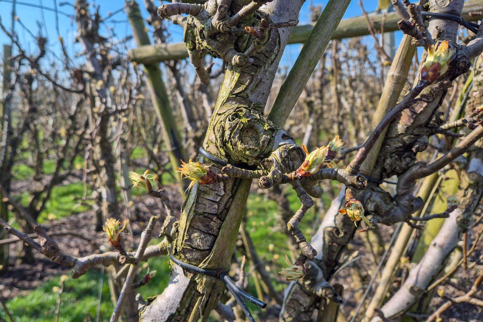 In verschillende boomgaarden beginnen de perenbomen hun bloemknoppen te laten zien. De bloesem zelf is nog niet open, maar je ziet duidelijk dat het seizoen eraan komt.