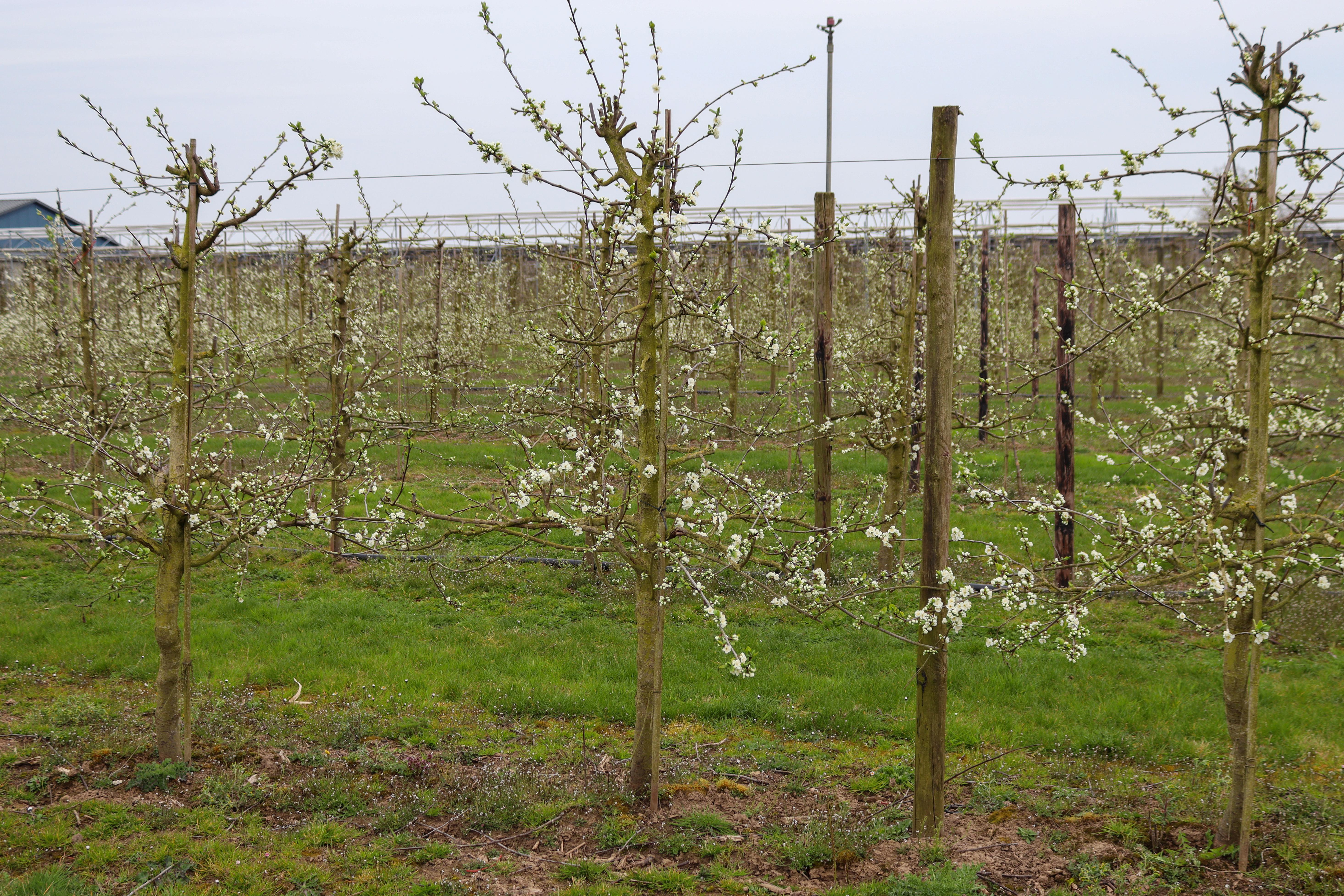 In een deel van de boomgaarden staan de pruimenbomen inmiddels al mooi in bloei. Het verschilt nog wel per boom: de ene is al wit van de bloesem, terwijl de andere nog even moet beginnen.