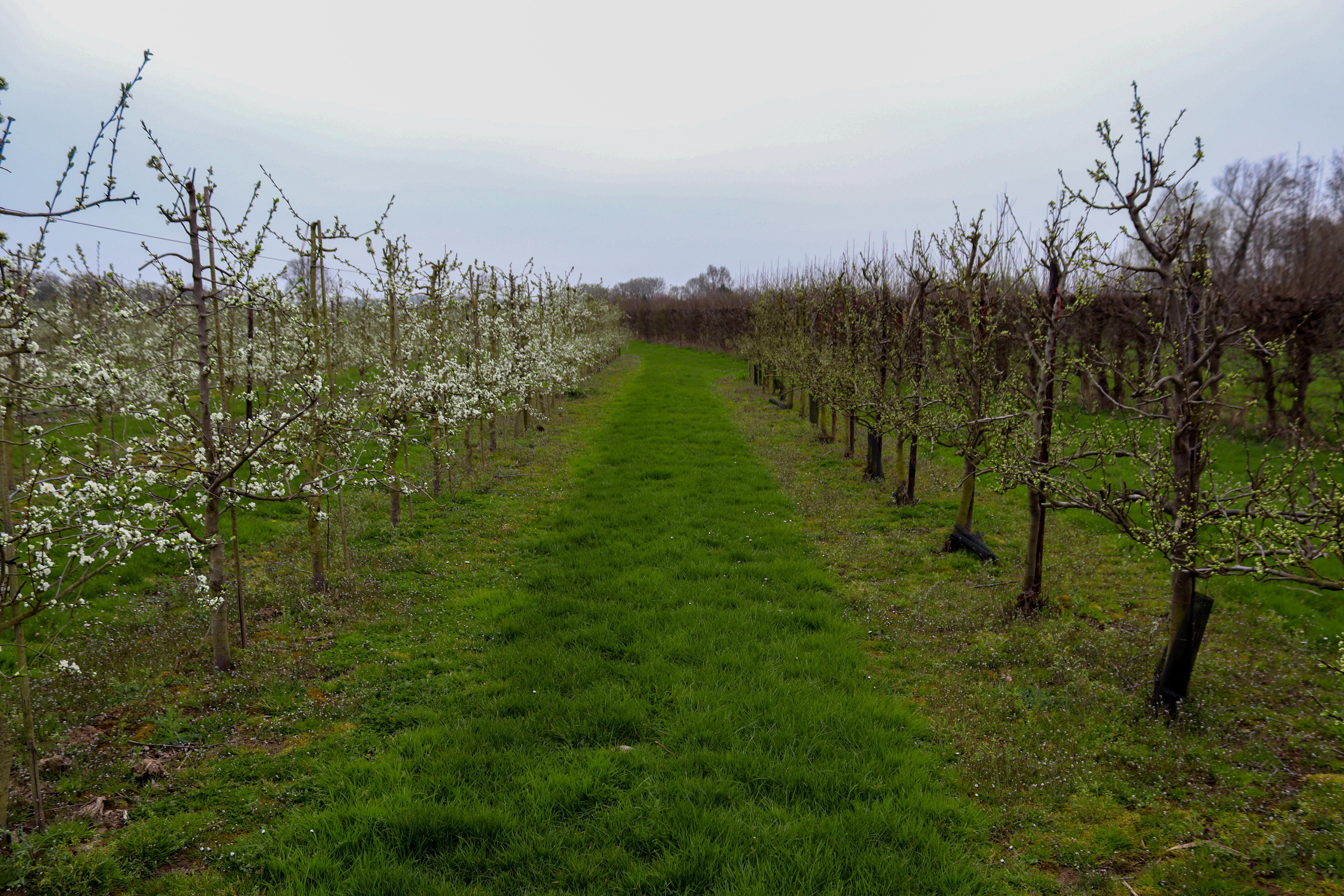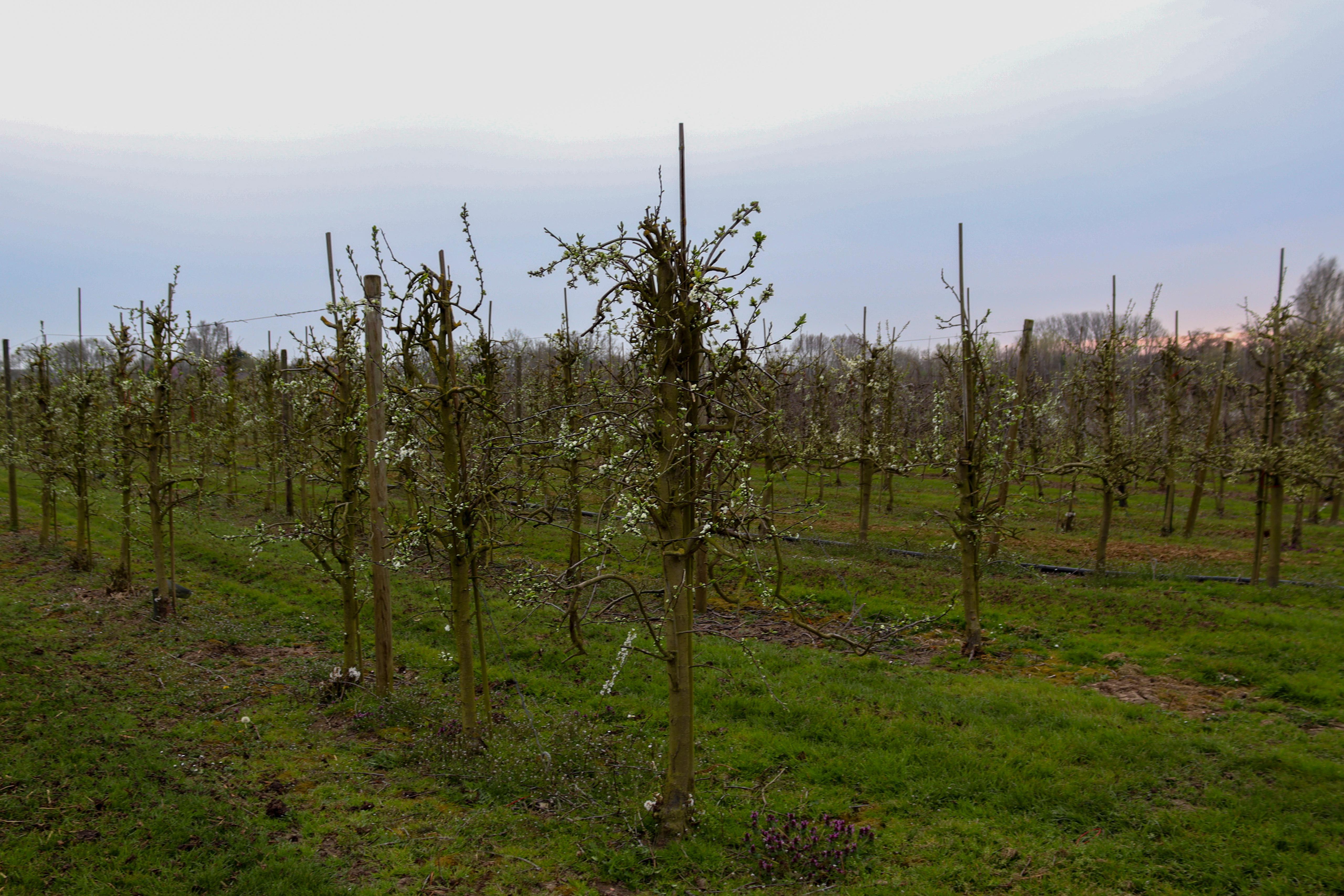 Links nog kale appelbomen zonder bloesem, rechts al volop leven bij de pruimenbomen šø Het laat mooi zien hoe groot de verschillen per fruitsoort kunnen zijn in deze periode.